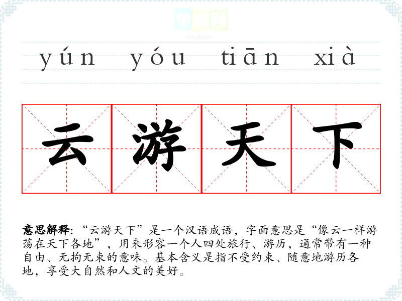 “云游天下”是一个汉语成语,字面意思是“像云一样游荡在天下各地”,用来形容一个人四处旅行、游历,通常带有一种自由、无拘无束的意味。基本含义是指不受约束、随意地游历各地,享受大自然和人文的美好。