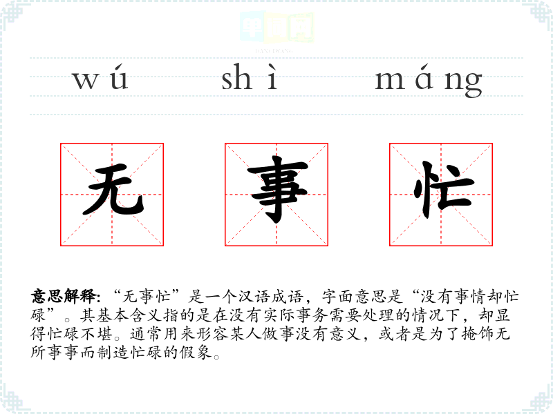 “无事忙”是一个汉语成语,字面意思是“没有事情却忙碌”。其基本含义指的是在没有实际事务需要处理的情况下,却显得忙碌不堪。通常用来形容某人做事没有意义,或者是为了掩饰无所事事而制造忙碌的假象。