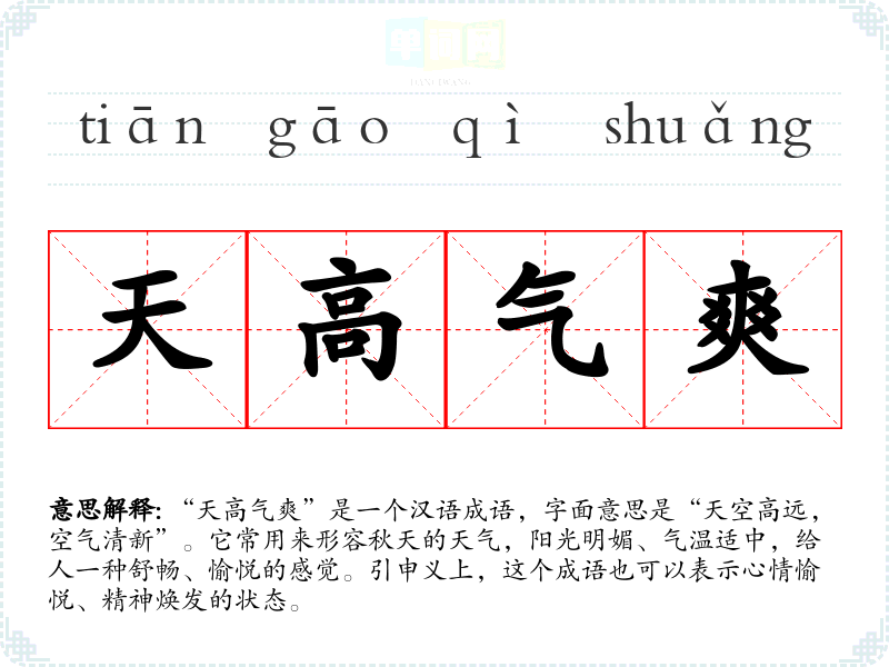 | 天高气爽 | 形容秋天天空高远明朗、气候凉爽宜人。 |