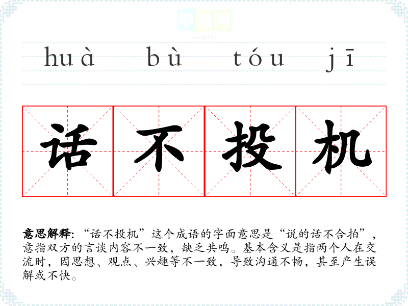 “话不投机”这个成语的字面意思是“说的话不合拍”,意指双方的言谈内容不一致,缺乏共鸣。基本含义是指两个人在交流时,因思想、观点、兴趣等不一致,导致沟通不畅,甚至产生误解或不快。