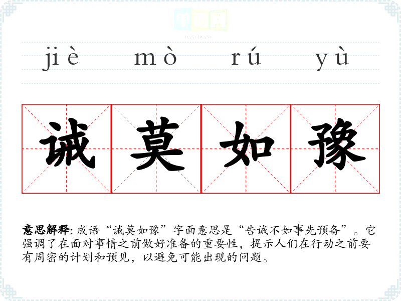 成语“诫莫如豫”字面意思是“告诫不如事先预备”。它强调了在面对事情之前做好准备的重要性,提示人们在行动之前要有周密的计划和预见,以避免可能出现的问题。