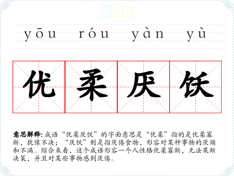 成语“优柔厌饫”的字面意思是“优柔”指的是优柔寡断,犹豫不决;“厌饫”则是指厌倦食物,形容对某种事物的厌烦和不满。综合来看,这个成语形容一个人性格优柔寡断,无法果断决策,并且对某些事物感到厌倦。