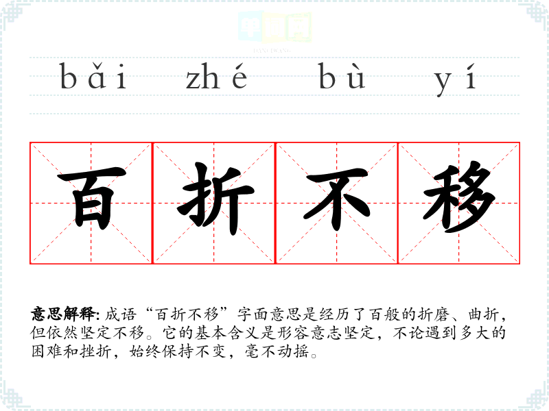 成语“百折不移”字面意思是经历了百般的折磨、曲折,但依然坚定不移。它的基本含义是形容意志坚定,不论遇到多大的困难和挫折,始终保持不变,毫不动摇。