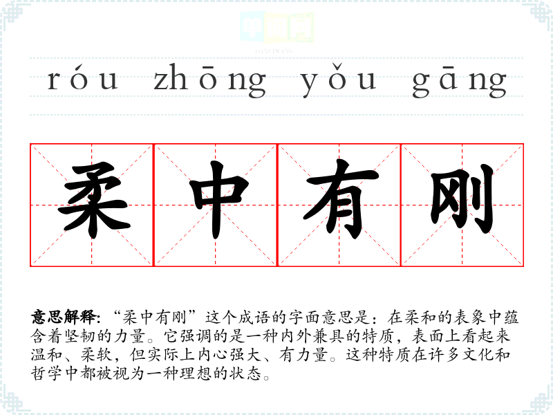 “柔中有刚”这个成语的字面意思是:在柔和的表象中蕴含着坚韧的力量。它强调的是一种内外兼具的特质,表面上看起来温和、柔软,但实际上内心强大、有力量。这种特质在许多文化和哲学中都被视为一种理想的状态。