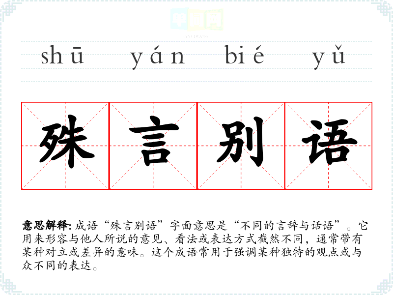成语“殊言别语”字面意思是“不同的言辞与话语”。它用来形容与他人所说的意见、看法或表达方式截然不同,通常带有某种对立或差异的意味。这个成语常用于强调某种独特的观点或与众不同的表达。