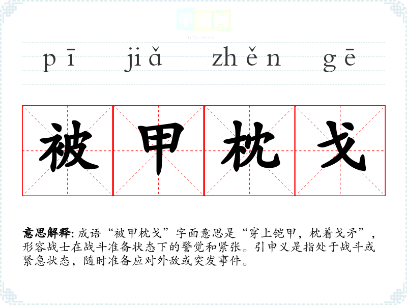 成语“被甲枕戈”字面意思是“穿上铠甲,枕着戈矛”,形容战士在战斗准备状态下的警觉和紧张。引申义是指处于战斗或紧急状态,随时准备应对外敌或突发**。