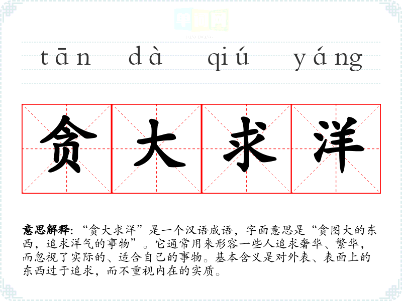 | 贪大求洋 | 洋:指外国的。贪图大的和外国的。指不根据实际情况而追求规模大的或国外的做法。 |