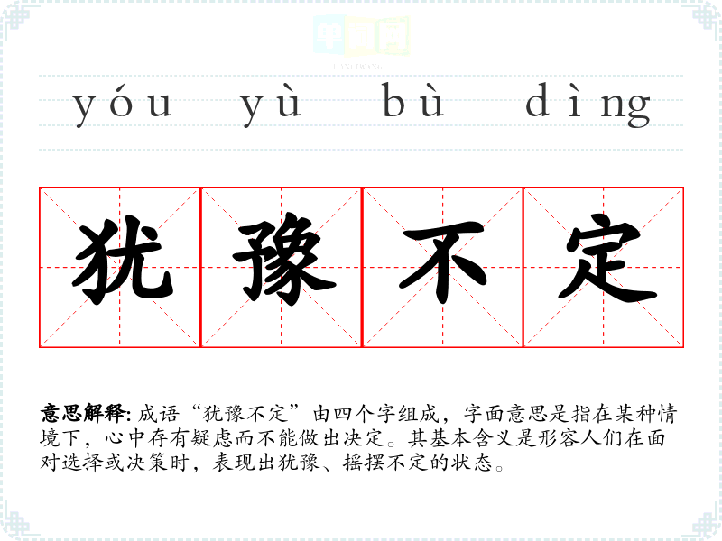 成语“犹豫不定”由四个字组成,字面意思是指在某种情境下,心中存有疑虑而不能做出决定。其基本含义是形容人们在面对选择或决策时,表现出犹豫、摇摆不定的状态。