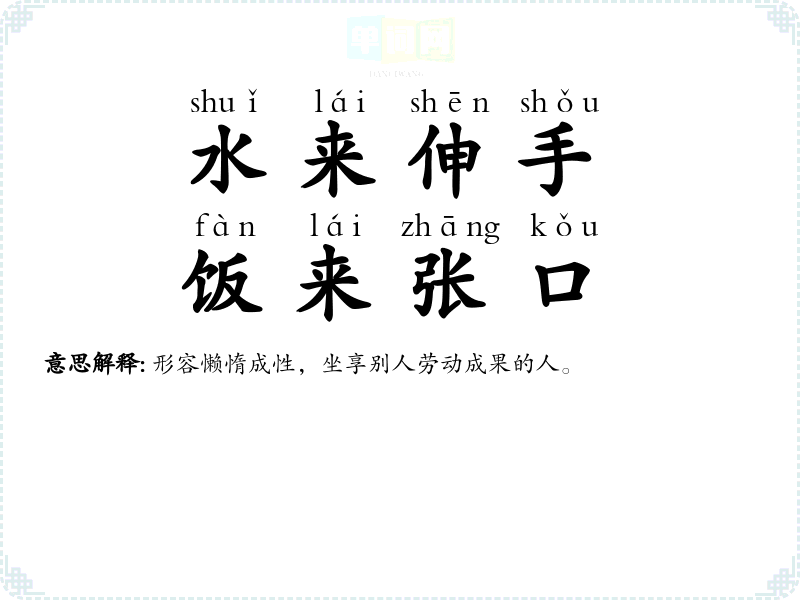 | 一粥一饭,当思来处不易 | 一口粥,一口饭,都应当想到来得不容易。劝告人们要尊重劳动,爱惜粮食。 |