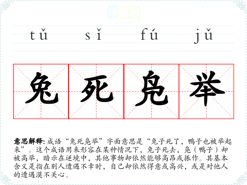 成语“兔死凫举”字面意思是“兔子死了,鸭子也被举起来”。这个成语用来形容在某种情况下,兔子死去,凫(鸭子)却被高举,暗示在逆境中,其他事物却依然能够高昂或振作。其基本含义是指在别人遭遇不幸时,自己却依然得意或高兴,或是对他人的遭遇漠不关心。