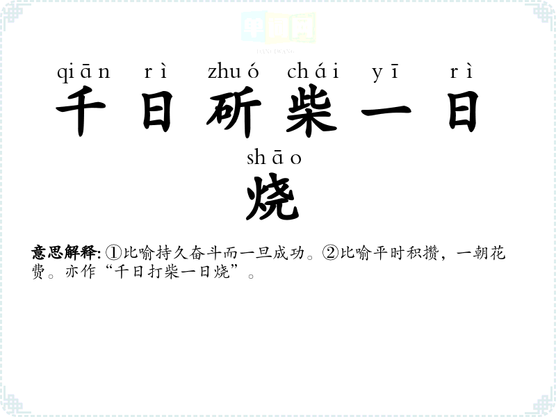 | 千日打柴一日烧 | 比喻持久奋斗而一旦成功。也比喻平时积攒,一朝花费。同“千日斫柴一日烧”。 |