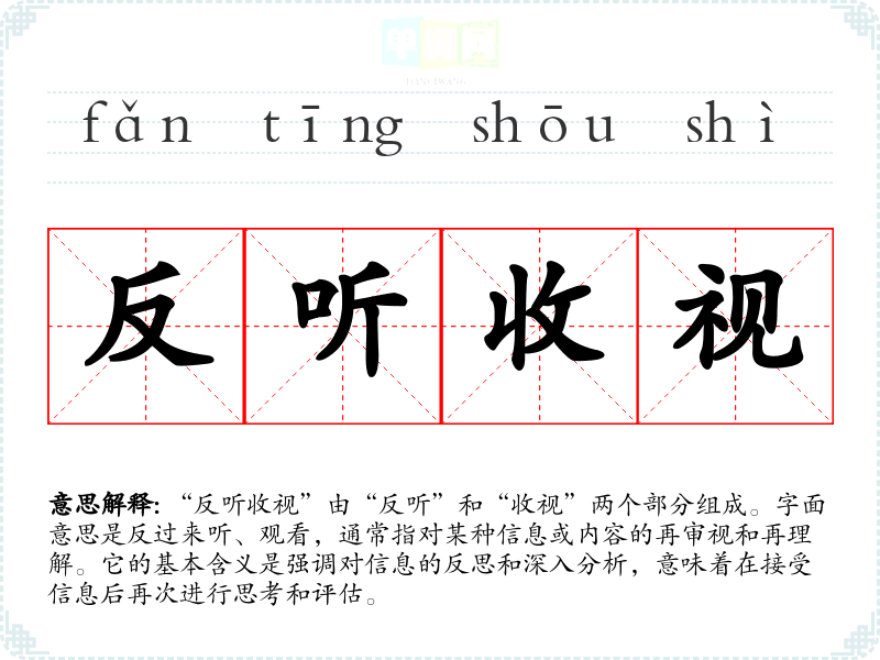 “反听收视”由“反听”和“收视”两个部分组成。字面意思是反过来听、观看,通常指对某种信息或内容的再审视和再理解。它的基本含义是强调对信息的反思和深入分析,意味着在接受信息后再次进行思考和评估。