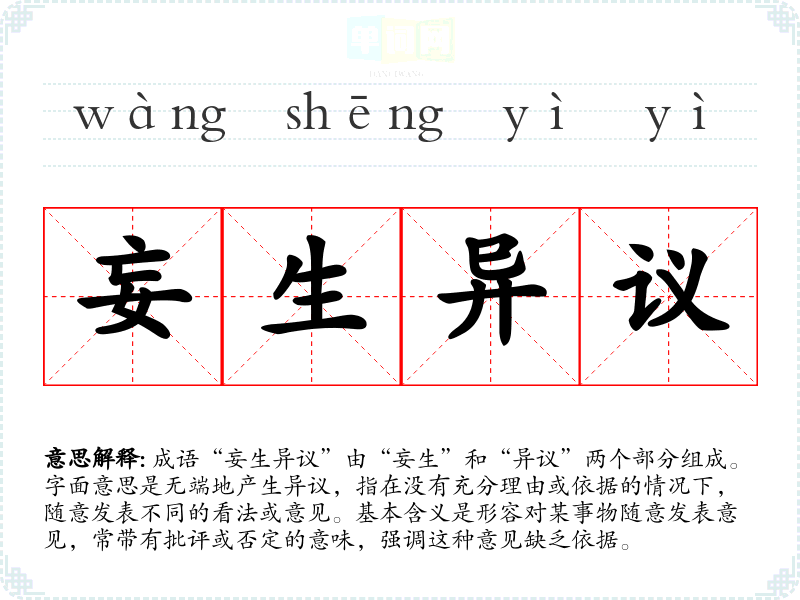 成语“妄生异议”由“妄生”和“异议”两个部分组成。字面意思是无端地产生异议,指在没有充分理由或依据的情况下,随意发表不同的看法或意见。基本含义是形容对某事物随意发表意见,常带有批评或否定的意味,强调这种意见缺乏依据。