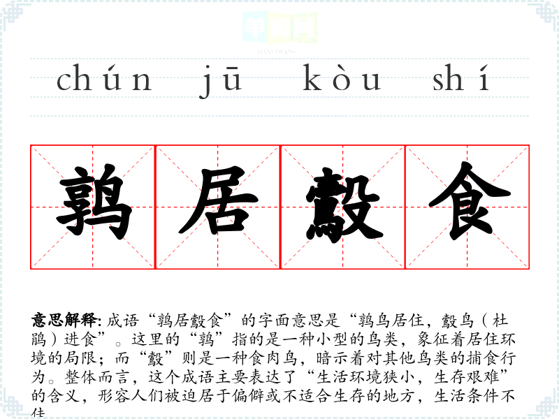 成语“鹑居鷇食”的字面意思是“鹑鸟居住,鷇鸟(杜鹃)进食”。这里的“鹑”指的是一种小型的鸟类,象征着居住环境的局限;而“鷇”则是一种食肉鸟,暗示着对其他鸟类的捕食行为。整体而言,这个成语主要表达了“生活环境狭小,生存艰难”的含义,形容人们被迫居于偏僻或不适合生存的地方,生活条件不佳。