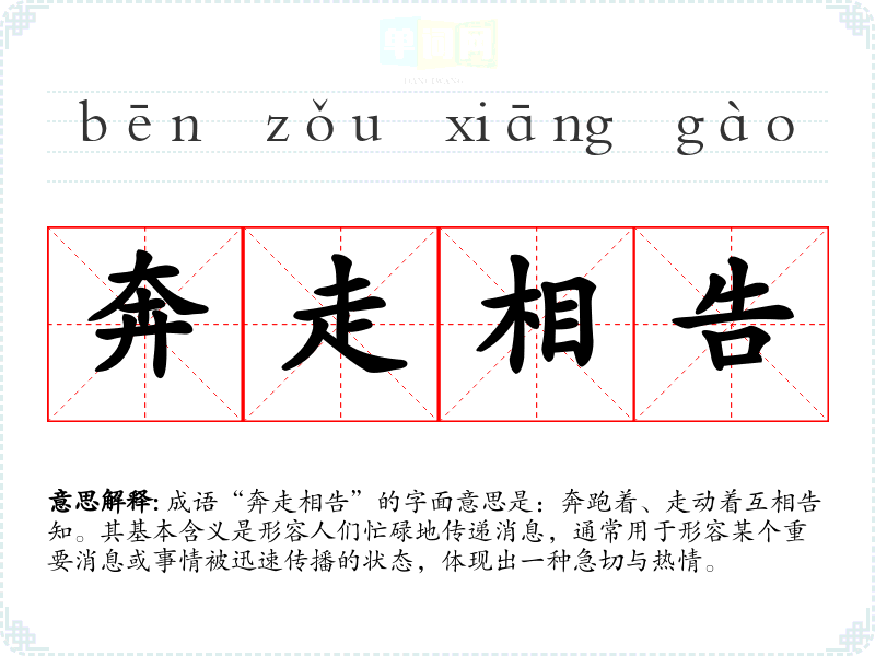 成语“奔走相告”的字面意思是:奔跑着、走动着互相告知。其基本含义是形容人们忙碌地传递消息,通常用于形容某个重要消息或事情被迅速传播的状态,体现出一种急切与热情。