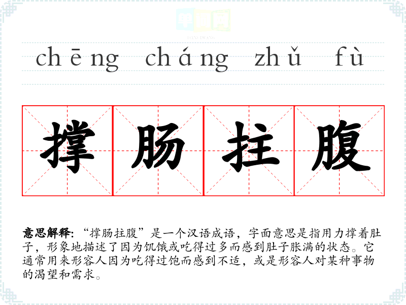 “撑肠拄腹”是一个汉语成语,字面意思是指用力撑着肚子,形象地描述了因为饥饿或吃得过多而感到肚子胀满的状态。它通常用来形容人因为吃得过饱而感到不适,或是形容人对某种事物的渴望和需求。