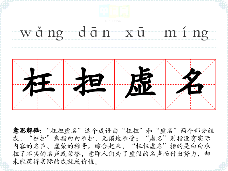 “枉担虚名”这个成语由“枉担”和“虚名”两个部分组成。“枉担”意指白白承担、无谓地承受;“虚名”则指没有实际内容的名声、虚荣的称号。综合起来,“枉担虚名”指的是白白承担了不实的名声或荣誉,意即人们为了虚假的名声而付出努力,却未能获得实际的成就或价值。