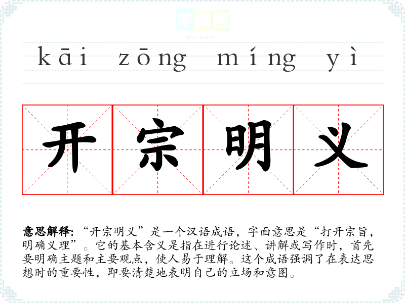 “开宗明义”是一个汉语成语,字面意思是“打开宗旨,明确义理”。它的基本含义是指在进行论述、讲解或写作时,首先要明确主题和主要观点,使人易于理解。这个成语强调了在表达思想时的重要性,即要清楚地表明自己的立场和意图。