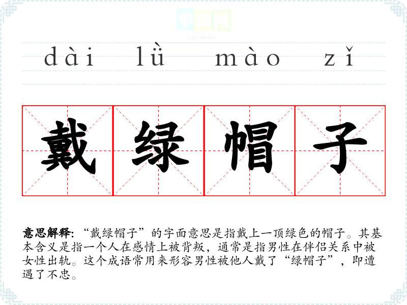 “戴绿帽子”的字面意思是指戴上一顶绿色的帽子。其基本含义是指一个人在感情上被背叛,通常是指男性在伴侣关系中被女性出轨。这个成语常用来形容男性被他人戴了“绿帽子”,即遭遇了不忠。