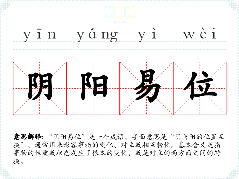 在**文化中,阴阳代表了宇宙的基本法则,强调变化的必然性和对立统一的哲学思想。因此,“阴阳易位”不仅是一种语言表达,也反映了深厚的文化背景,强调了在生活中不可避免的变化。在现代社会,这个成语仍然适用,能够有效表达社会、经济和个人生活中的变化。