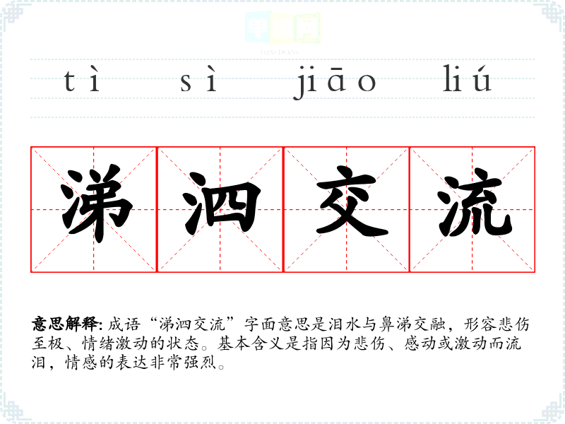 成语“涕泗交流”字面意思是泪水与鼻涕交融,形容悲伤至极、情绪激动的状态。基本含义是指因为悲伤、感动或激动而流泪,情感的表达非常强烈。