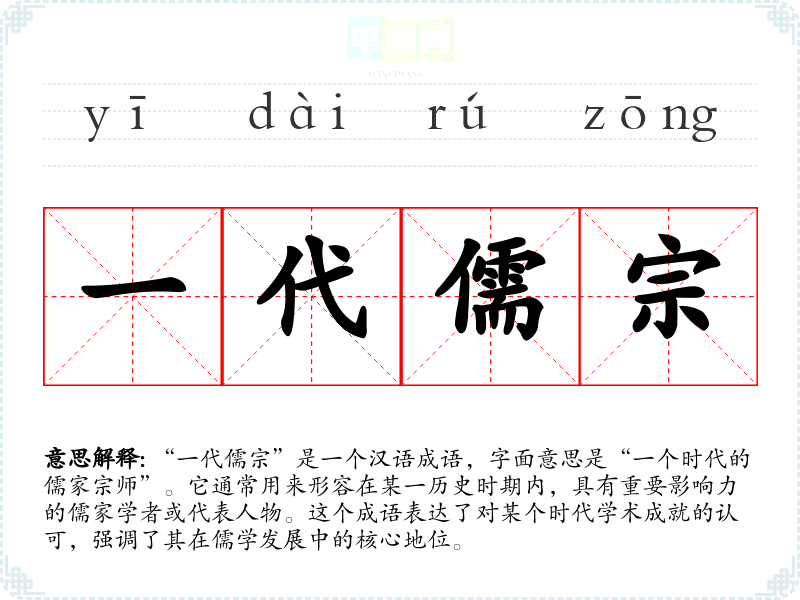 “一代儒宗”是一个汉语成语,字面意思是“一个时代的儒家宗师”。它通常用来形容在某一历史时期内,具有重要影响力的儒家学者或代表人物。这个成语表达了对某个时代学术成就的认可,强调了其在儒学发展中的核心地位。