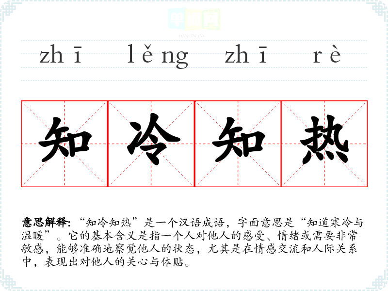 “知冷知热”是一个汉语成语,字面意思是“知道寒冷与温暖”。它的基本含义是指一个人对他人的感受、情绪或需要非常敏感,能够准确地察觉他人的状态,尤其是在情感交流和人际关系中,表现出对他人的关心与体贴。