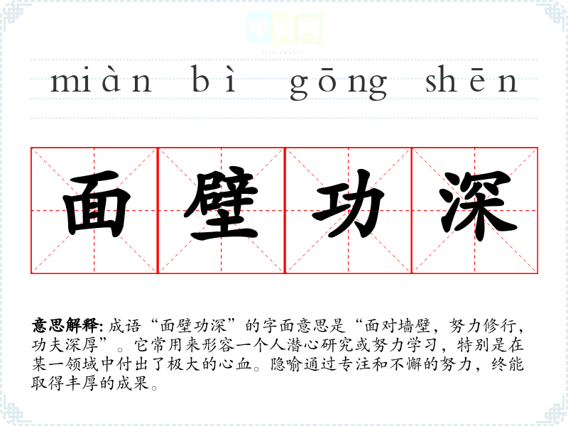 成语“面壁功深”的字面意思是“面对墙壁,努力修行,功夫深厚”。它常用来形容一个人潜心研究或努力学*,特别是在某一领域中付出了极大的心血。隐喻通过专注和不懈的努力,终能取得丰厚的成果。