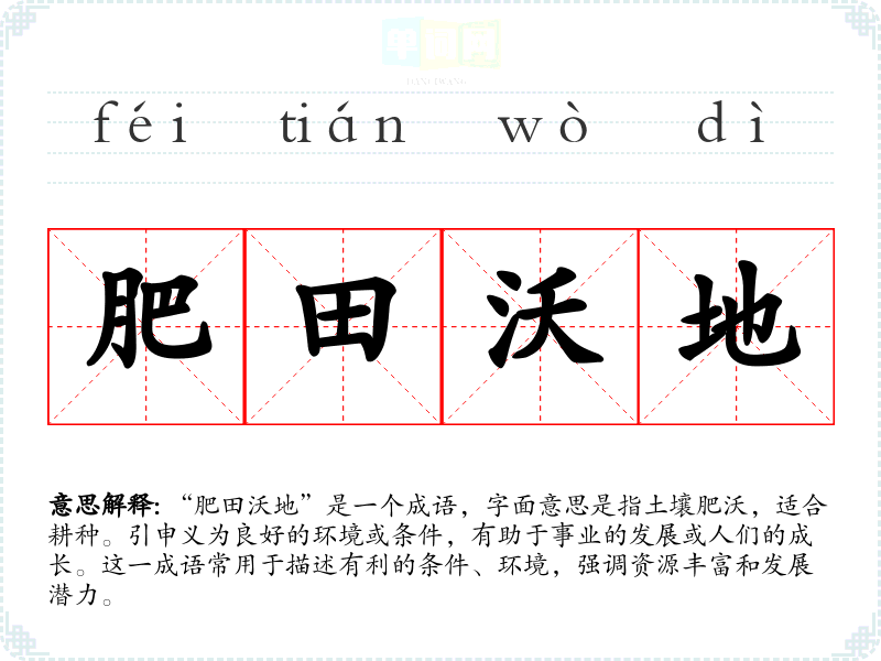 “肥田沃地”是一个成语,字面意思是指土壤肥沃,适合耕种。引申义为良好的环境或条件,有助于事业的发展或人们的成长。这一成语常用于描述有利的条件、环境,强调资源丰富和发展潜力。
