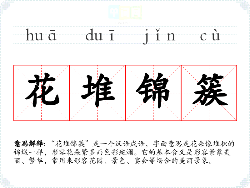“花堆锦簇”是一个汉语成语,字面意思是花朵像堆积的锦缎一样,形容花朵繁多而色彩斑斓。它的基本含义是形容景象美丽、繁华,常用来形容花园、景色、宴会等场合的美丽景象。