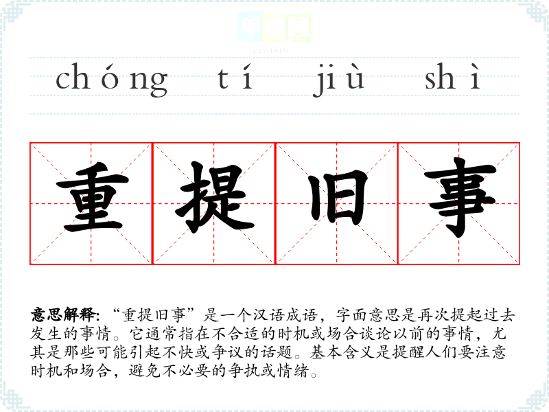 “重提旧事”是一个汉语成语,字面意思是再次提起过去发生的事情。它通常指在不合适的时机或场合谈论以前的事情,尤其是那些可能引起不快或争议的话题。基本含义是提醒人们要注意时机和场合,避免不必要的争执或情绪。