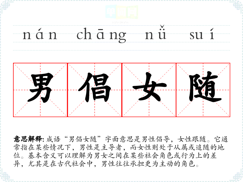 成语“男倡女随”字面意思是男性倡导,女性跟随。它通常指在某些情况下,男性是主导者,而女性则处于从属或追随的地位。基本含义可以理解为男女之间在某些社会角色或行为上的差异,尤其是在古代社会中,男性往往承担更为主动的角色。