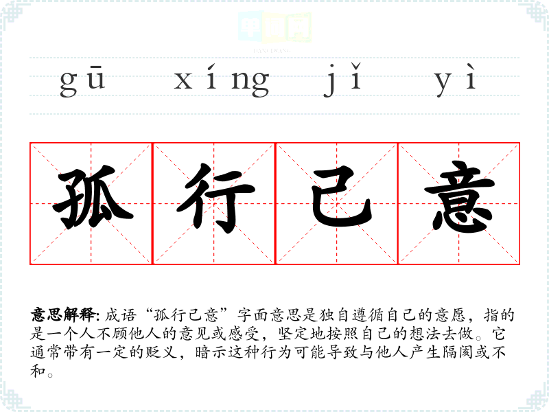 成语“孤行己意”字面意思是独自遵循自己的意愿,指的是一个人不顾他人的意见或感受,坚定地按照自己的想法去做。它通常带有一定的贬义,暗示这种行为可能导致与他人产生隔阂或不和。