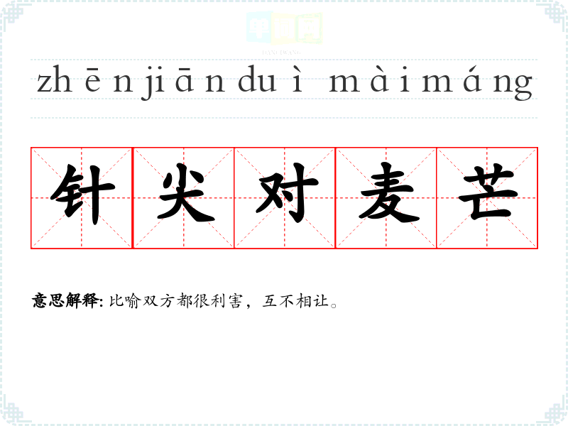 | 针尖对麦芒 | 比喻双方都很利害,互不相让。 |