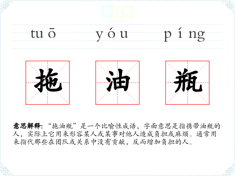 “拖油瓶”是一个比喻性成语,字面意思是指携带油瓶的人,实际上它用来形容某人或某事对他人造成负担或麻烦。通常用来指代那些在团队或关系中没有贡献,反而增加负担的人。