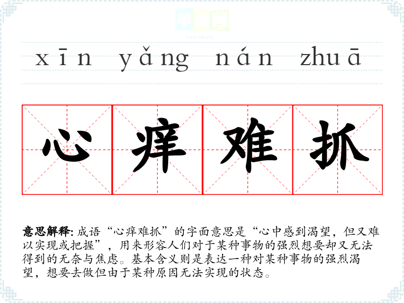 “心痒难抓”并没有明确的历史典故或文学出处,但其结构与许多古代成语相似,通常是通过形象的描绘来表达心理状态,这种表达方式在**古代文学中较为常见。它的字面构成可以追溯到古代汉语中的“心痒”与“难抓”,说明了内心的焦虑和想要抓住某种情感或事物的矛盾心理。