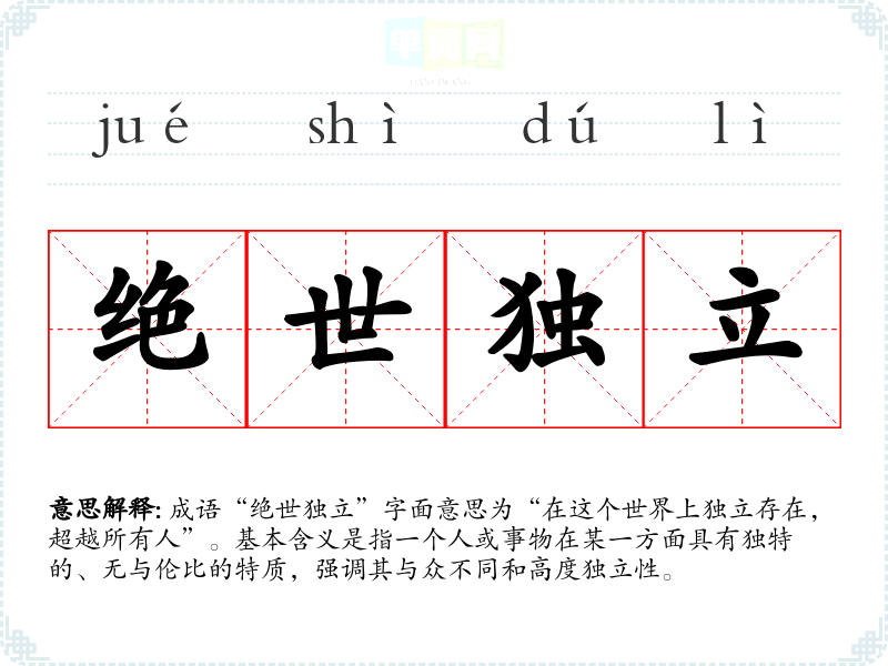 成语“绝世独立”字面意思为“在这个世界上独立存在,超越所有人”。基本含义是指一个人或事物在某一方面具有独特的、无与伦比的特质,强调其与众不同和高度独立性。
