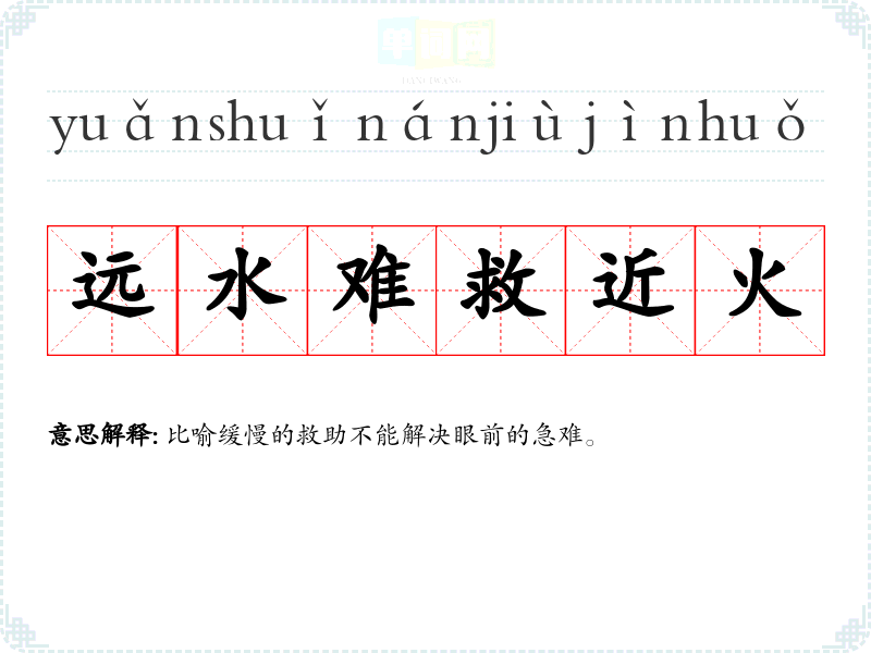 | 远井不解近渴 | 指遥远的帮助解决不了目前迫切的需求。 |