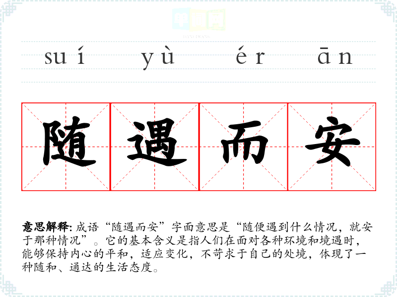 成语“随遇而安”字面意思是“随便遇到什么情况,就安于那种情况”。它的基本含义是指人们在面对各种环境和境遇时,能够保持内心的平和,适应变化,不苛求于自己的处境,体现了一种随和、通达的生活态度。