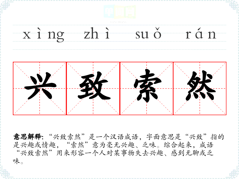 “兴致索然”是一个汉语成语,字面意思是“兴致”指的是兴趣或情趣,“索然”意为毫无兴趣、乏味。综合起来,成语“兴致索然”用来形容一个人对某事物失去兴趣、感到无聊或乏味。