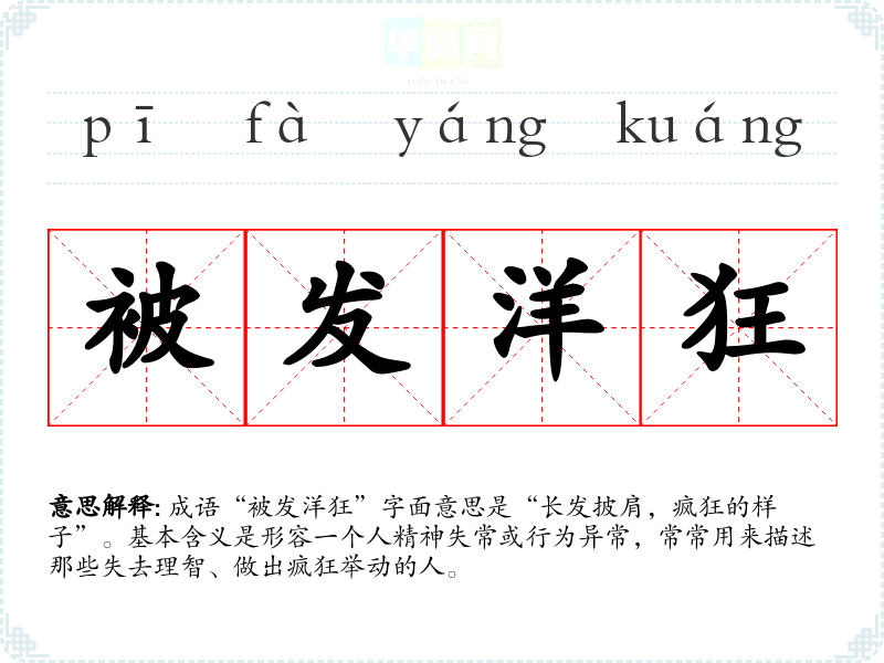 成语“被发洋狂”字面意思是“长发披肩,疯狂的样子”。基本含义是形容一个人精神失常或行为异常,常常用来描述那些失去理智、做出疯狂举动的人。