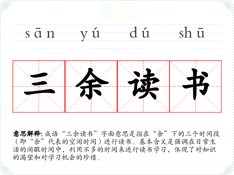 成语“三余读书”字面意思是指在“余”下的三个时间段(即“余”代表的空闲时间)进行读书。基本含义是强调在日常生活的闲暇时间中,利用不多的时间来进行读书学,体现了对知识的渴望和对学机会的珍惜。