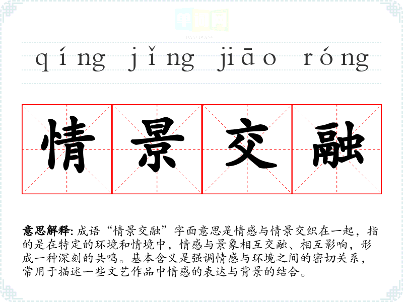 成语“情景交融”字面意思是情感与情景交织在一起,指的是在特定的环境和情境中,情感与景象相互交融、相互影响,形成一种深刻的共鸣。基本含义是强调情感与环境之间的密切关系,常用于描述一些文艺作品中情感的表达与背景的结合。