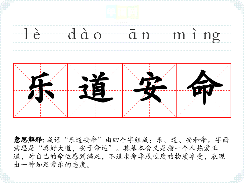 成语“乐道安命”由四个字组成:乐、道、安和命。字面意思是“喜好大道,安于命运”。其基本含义是指一个人热爱正道,对自己的命运感到满足,不追求奢华或过度的物质享受,表现出一种知足常乐的态度。