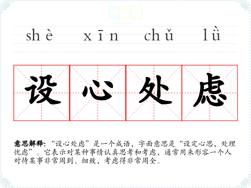 “设心处虑”让我联想到认真、谨慎、周到的态度。在快速发展的现代社会中,许多人常常忽视深思熟虑的重要性,因此这个成语提醒我们在面对各种选择时,保持冷静与理智。