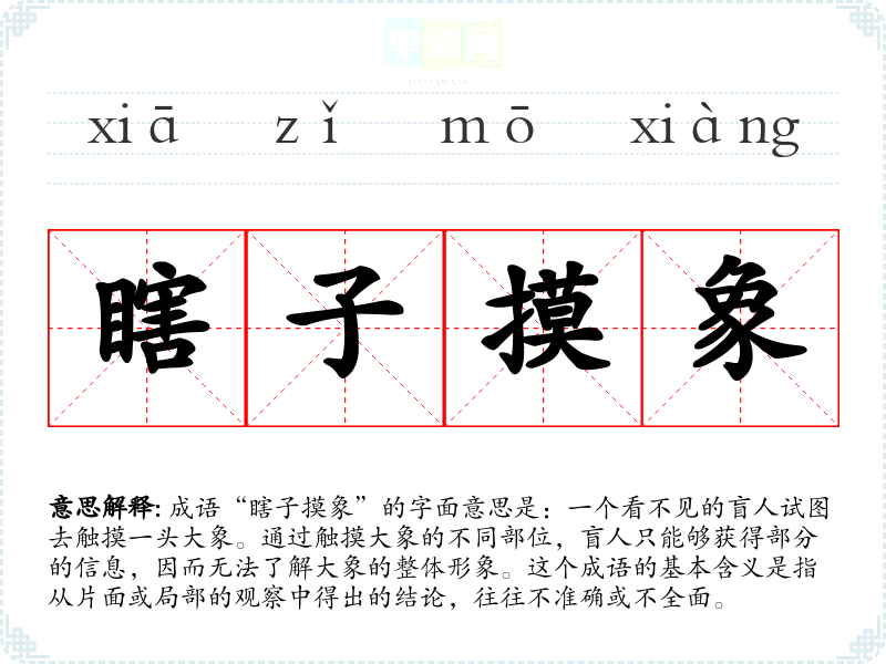 | 瞎子摸象 | 比喻对事物一知半解,不对全局作判断。 |