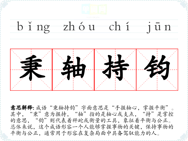 成语“秉轴持钧”字面意思是“手握轴心,掌握平衡”。其中,“秉”意为握持,“轴”指的是轴心或支点,“持”是掌控的意思,“钧”则代表着秤砣或衡量的工具,象征着平衡与公正。总体来说,这个成语形容一个人能够掌握事物的关键,保持事物的平衡与公正,通常用于形容在复杂局面中具备驾驭能力的人。