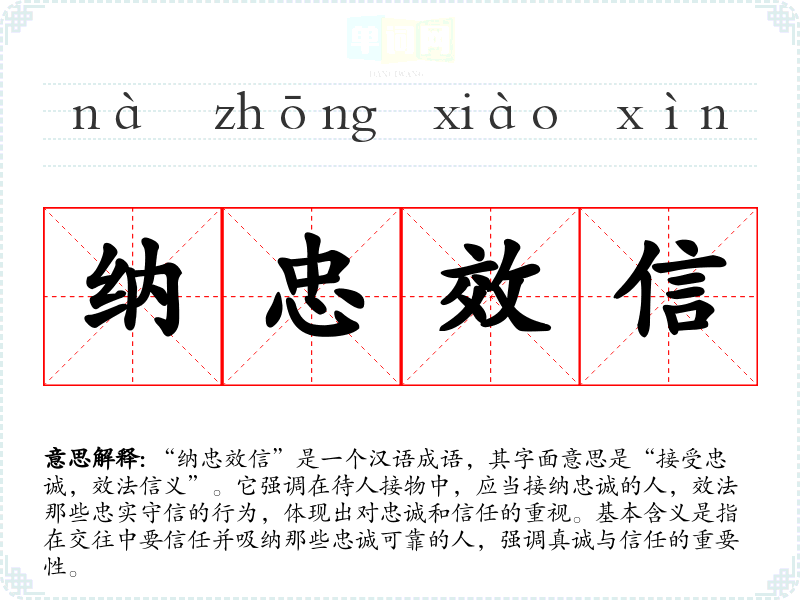 “纳忠效信”并没有明确的历史典故或文学出处,但它的构成可以追溯到**传统文化中对忠诚和信义的重视。在古代儒家思想中,忠与信是为人处世的重要准则。这一成语反映了古人对人际关系的看重,强调了在社会交往中应当把忠诚和信任放在重要的位置。