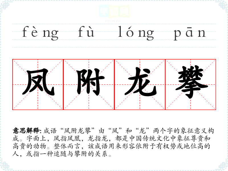 成语“凤附龙攀”由“凤”和“龙”两个字的象征意义构成。字面上,凤指凤凰,龙指龙,都是**传统文化中象征尊贵和高贵的动物。整体而言,该成语用来形容依附于有权势或地位高的人,或指一种追随与攀附的关系。