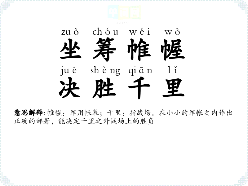 | 坐筹帷幄,决胜千里 | 帷幄:军用帐幕;千里:指战场。在小小的军帐之内作出正确的部署,能决定千里之外战场上的胜负 |
